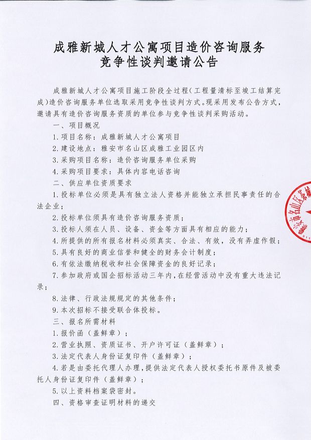 成雅新城人才公寓項(xiàng)目造價(jià)咨詢服務(wù)競爭性談判邀請公告